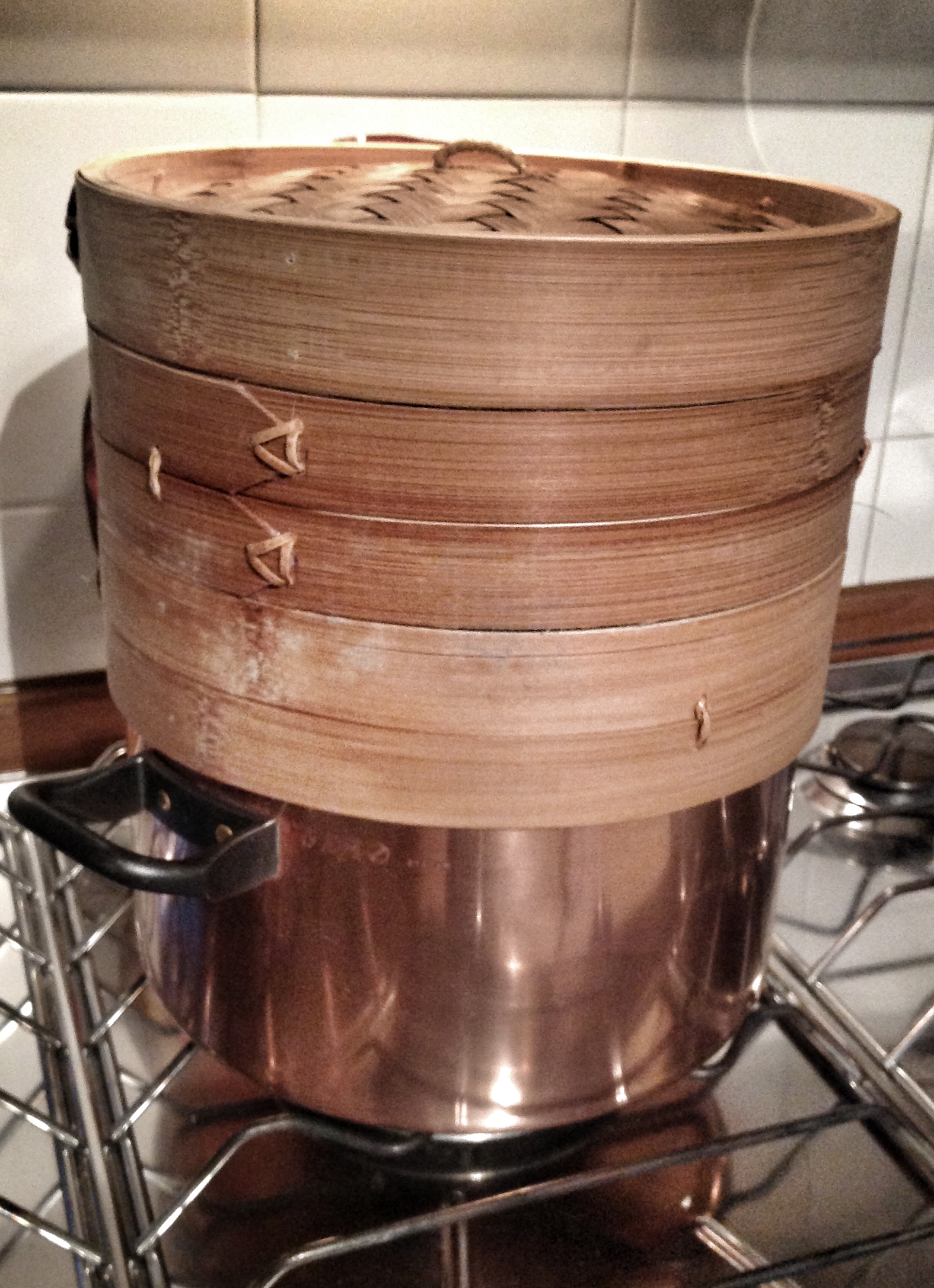 Poi mettete sul fuoco una pentola piuttosto capiente, della misura giusta per i cestelli, colma per 3/4 di acqua. Quando l’acqua bolle, ponete il cestello di bambù sulla pentola. Il cestello è multi-comparto (il nostro ha due comparti), sicché su quello più basso, vicino al calore più forte, noi abbiamo messo le ostriche, mentre su quello più alto le vongole. Il cestello va ovviamente chiuso con lo specifico coperchio.