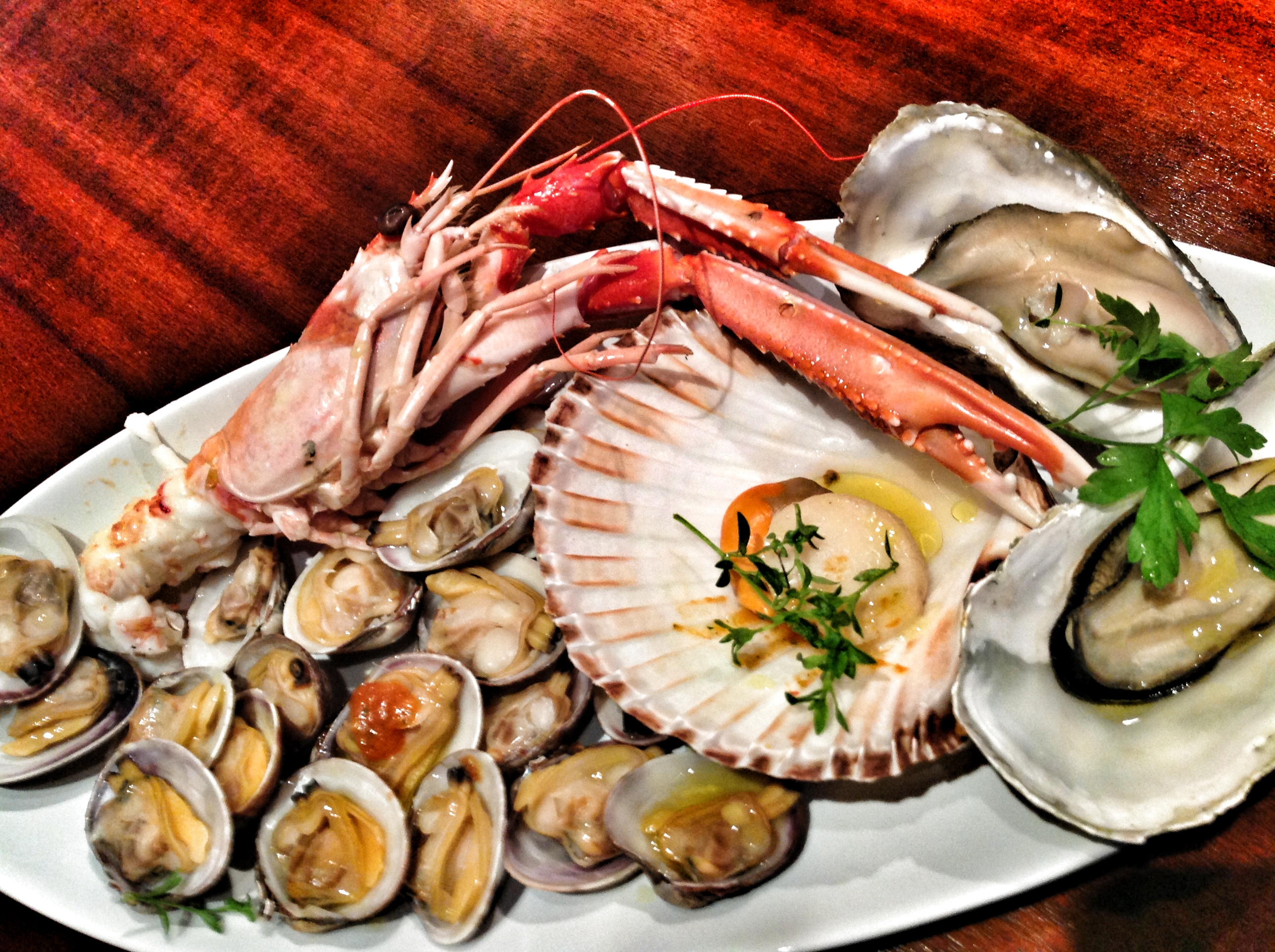 Quando è tutto cotto, rimettete per meno di 1′ ostriche e vongole nel cestello a riscaldarsi (ormai sono cotte), con delicatezza, per evitare che i molluschi si stacchino dal guscio; nel frattempo impiattate scampi e capesante. Poi terminate con vongole e ostriche calde.